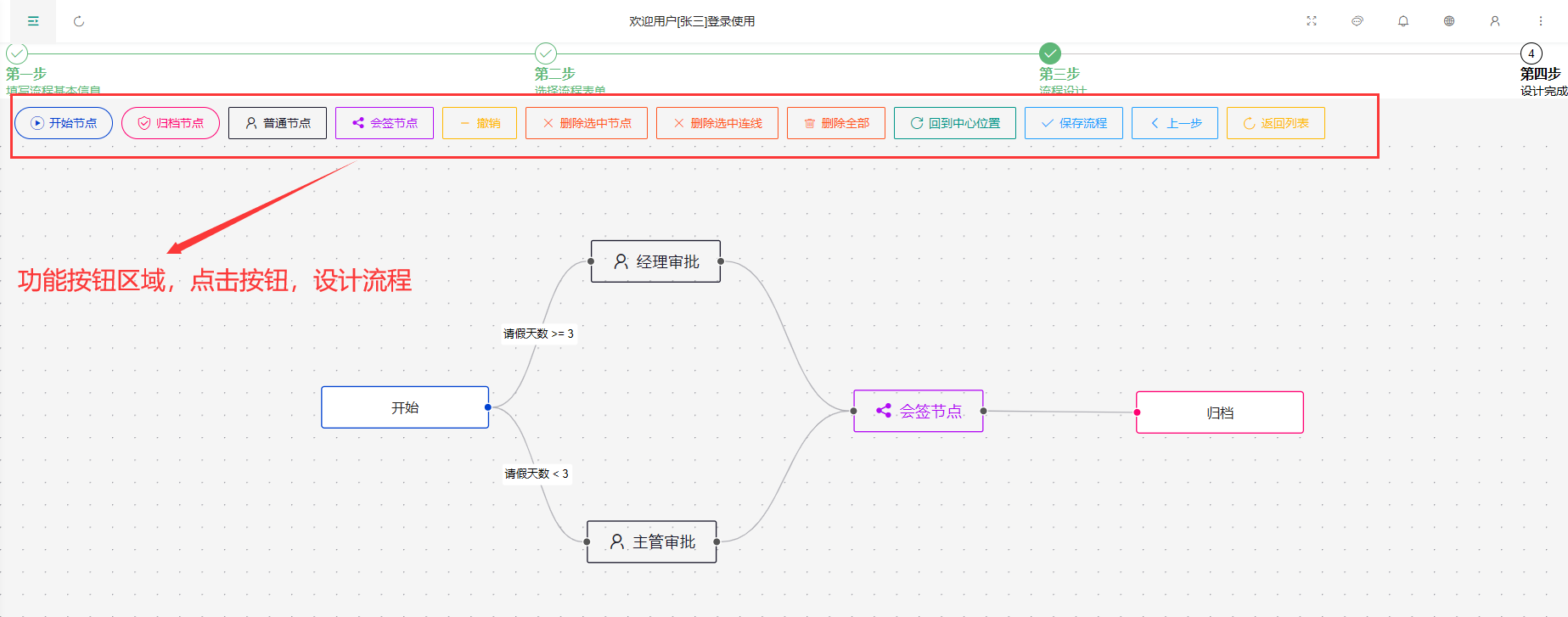 当设计好流程后,点击第三步中的【保存流程】按钮进行保存,进入下一个界面。